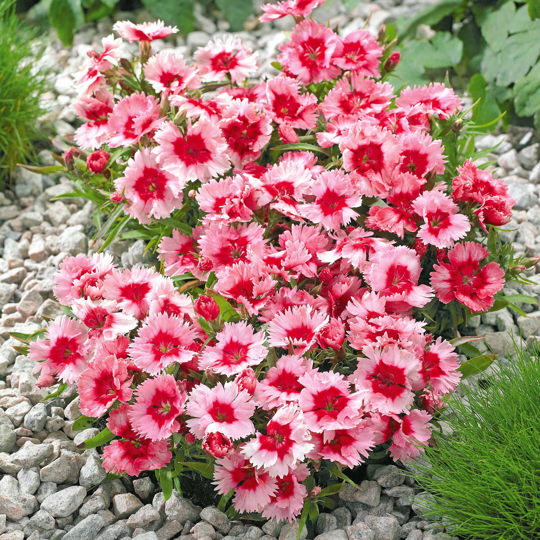 Ravissant petit oeillet compact et florifère, donnant une abondance de fleurs bicolores rose/pourpre. En rocaille, en bordure ou pot, l'effet est garanti ! Culture facile en sol ordinaire, même pauvre et caillouteux.
