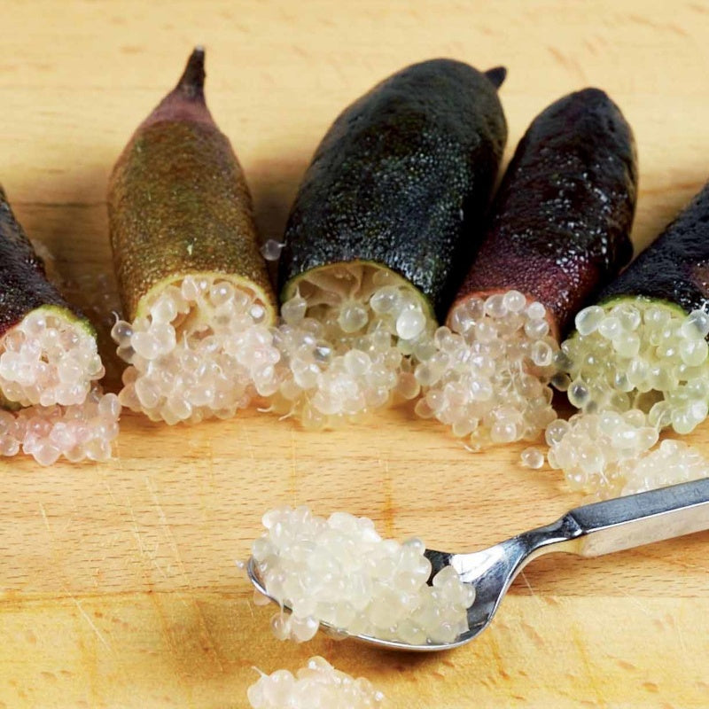 Cultivé pour ses fruits, davantage que pour son aspect décoratif, le Microcitrus australasica donne le citron caviar tant apprécié des grands chefs. Les fruits du citron caviar ont une forme allongée et ont la taille d'un doigt. Derrière sa peau verte, lisse et fine, le fruit renferme de multiples petites capsules s’apparentant à du caviar. Les petites billes contiennent un jus acidulé au goût unique, proche de celui du citron classique et du pamplemousse.