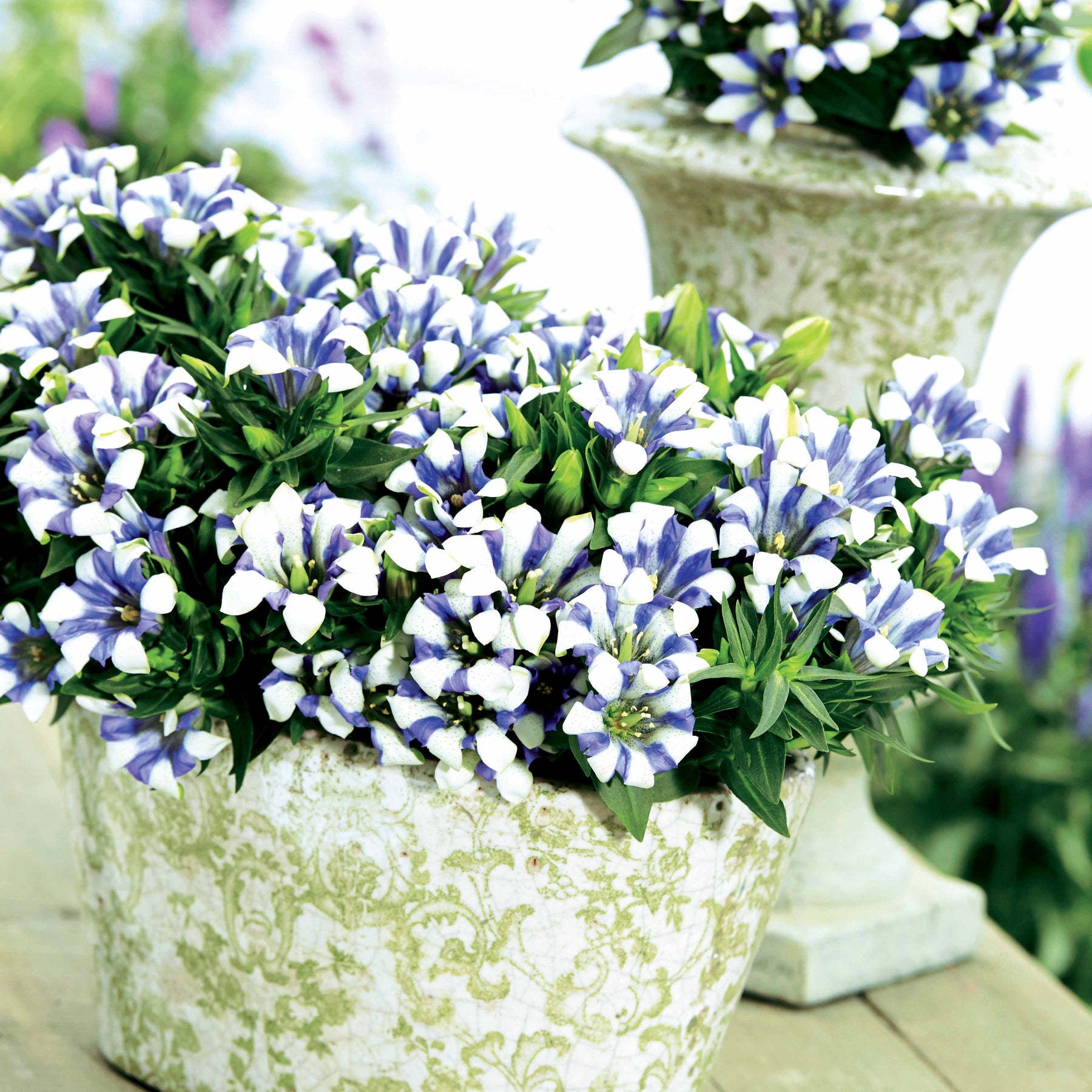 La Gentiane 'Diamant des montagnes' se distingue avec ses fleurs blanches striées de bleu intense, qui donnent un effet vraiment spectaculaire en fin d'été.