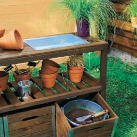 Table de préparation teintée brun. Marque: BURGER JARDIPOLYS. Une table de préparation conçue pour jardiner de manière confortable: faire vos semis, rempoter, transplanter...tout est plus facile en ayant tout à hauteur. Son bac en zinc vous permet de rempoter vos plantes très facilement et de garder une zone de travail propre. Ses 3 caissons de rangement et son étagère vous permettront d'avoir à proximité tous vos outils. Dimensions hors tout: L 129 x P 45 x H 90 cm. Dimensions des caissons: L 39 x P 35,5 x H 39 cm. Caissons livrés montés. Matière: bois de pin certifié FSC et Zinc. Finition: traitement autoclave teinté brun.