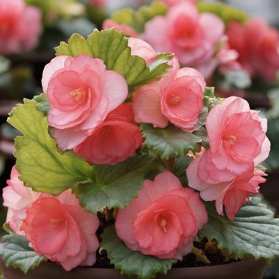 - Bégonia 'Gryphon': une variété avec des feuilles texturées et des fleurs roses.