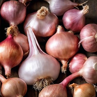 L'échalote rose est une variété originaire d'Asie centrale. Elle se distingue par sa peau rose, presque violette, et sa chair blanche légèrement rosée. Elle a une forme allongée et une texture ferme.