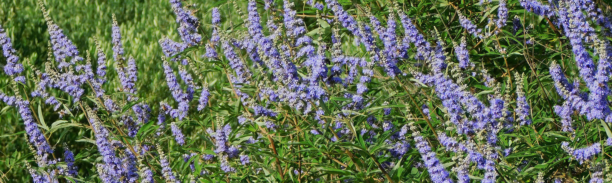 Le port érigé du gattilier, accompagné de ses feuilles palmées et ses fleurs en magnifiques épis, crée une stature gréement définie. Sa couronne ouverte et aérée permet à la lumière de filtrer, apportant une perspective dynamique et intéressante même dans des compositions paysagères mixtes.