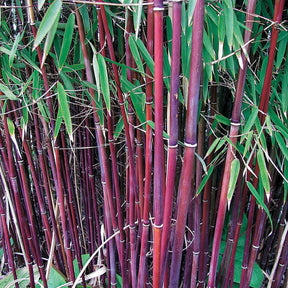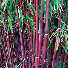 Très apprécié pour ses belles cannes colorées, ce bambou d’une grande élégance vous enchantera d’année en année. Originaire des régions montagneuses du Sichuan en Chine centrale, le Bambou à cannes rouges ou Fargesia scabrida ‘Asian Wonder’ est une graminée et fait partie de la famille des Poacées. Il produit des cannes (ou tiges) portant un fin feuillage persistant qui reste vert tout au long de l’année. Ce qui le distingue et en fait une plante d’exception, c’est la couleur de ses tiges rouge prune très décoratives. Elles créent un superbe contraste avec le vert des feuilles et apportent une touche d’exotisme très appréciable. Ce bambou de croissance modérée possède une autre qualité importante, celle de ne pas être traçant, c'est-à-dire qu’il ne se propage pratiquement pas dans le jardin et ne devient pas envahissant au bout de quelques années. Il est dit « non traçant » ou « cespiteux ». Cela permet de le cultiver facilement près de la maison, dans un petit massif ou même dans un grand pot sans risquer de voir ses racines abîmer la terrasse, les fondations ou autres constructions.