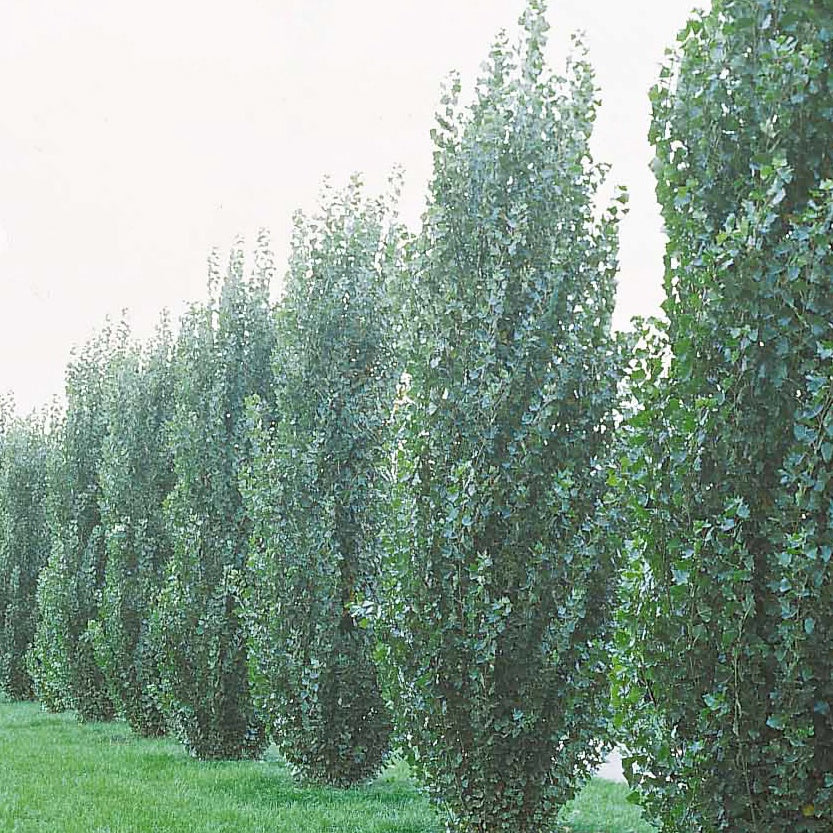 Parmi les arbres à croissance très rapide (plus de 80 cm par an), qui se prêtent bien à la confection de haies, le peuplier pyramidal Populus nigra 'Italica' est l'un des plus intéressants. II a des branches dressées verticales poussant près du tronc dont les feuilles s'agitent au moindre souffle d'air. Le peuplier pyramidal pousse dans tous les sols, à condition qu’ils ne soient pas trop secs. Petites feuilles vertes, luisantes, jaunes en automne, elles apparaissent tôt et tombent tardivement. Leur système racinaire s'accroit rapidement, il est conseillé de les planter à plus de 15 mètres des bâtiments. Les peupliers noirs d'Italie résistent au froid jusqu'à -15°C. Il forme très rapidement une excellente haie brise-vent pour les grands jardins.
