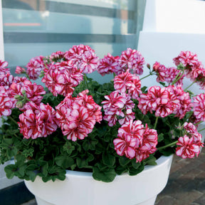 Pour créer une cascade fleurie durant tout l'été sur la rambarde d’un balcon ou dans une corbeille suspendue pour orner la façade de votre maison, misez sur le géranium-lierre qui a toutes les qualités : de longues tiges retombantes mesurant jusqu’à 60 centimètres de long, de magnifiques fleurs bicolores très abondantes réunies en bouquets fournis et des feuilles comparables au lierre (d’où leur nom).