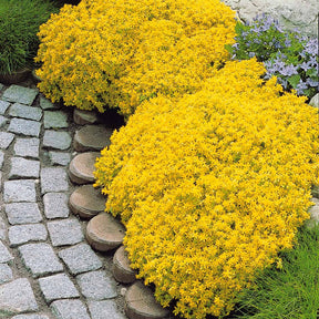 Au début de l’été, les fleurs étoilées du Poivre des murailles donnent du caractère au jardin. Il formera un écrin doré remarqué et remarquable qui, par ailleurs, ne demandera pas d’entretien particulier.