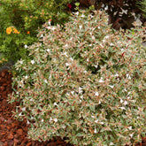 , ce qui en fait un choix idéal pour les jardins de taille modeste. Son feuillage est persistante, semi-persistante ou caduc selon les variétés, affichant souvent une belle panachure de blanc crème ou de jaune vif, avec des jeunes pousses rougeoyantes au printemps. Les fleurs de l'Abélia à grandes fleurs sont des clochettes charmantes, blanches ou roses, parfois parfumées, qui s'épanouissent de juin à octobre. L'une des caractéristiques notables de cette espèce est sa capacité à s'adapter à des conditions variées, puisqu'elle peut être plantée en massif, en haie ou même en pot.