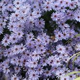L'aster (Symphyotrichum) est une plante vivace de la famille des Asteraceae. Originaire d'Amérique du Nord, cette variété Wood's light blue fait partie d'une espèce buissonnante parfaitement adaptée à l'hémisphère nord, de l'Europe à l'Asie. C’est une obtention horticole qui peut atteindre 30 cm de haut et 60 de large à maturité. Sa période de floraison s’étend entre la fin de l’été et le début de l’automne. Elle doit son nom d’origine grecque (aster) à ses fleurs qui s’ouvrent en forme d’étoile. Elles sont ordonnées en capitule, avec un cœur de fleurs entouré de ligules colorées. Leur ton varie du bleu au rose avec une dominante violette ou mauve. Leur feuillage est caduc, large et alterne. Feuilles et tiges sèchent et disparaissent pendant l'hiver, mais leurs racines, en dormance, demeurent vivantes et l’aster ressort au printemps.
