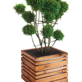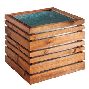 Bac en bois de pin LIGN Z 60. Marque: BURGER JARDIPOLYS. Un jeu de lignes extrêmement graphique dévoilant au travers des lames en bois l'acier du bac intérieur. Le bac intérieur étanche en zinc remplace parfaitement le géotextile. Sculptural! Dimensions hors tout: L60 x P60 x H50 cm. Epaisseur: 1.6cm. Matériau: bac en bois de pin certifié FSC et teinté brun, bac intérieur en acier, patins en caoutchouc noir. Finition: traitement autoclave. Capacité: 143L. Livré avec un bac intérieur (1 trou au milieu pour l'évacuation de l'eau) - bac avec rebords. Provenance du produit : Pologne.