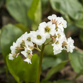 Le Bergénia Bressingham White, également appelé "plante des savetiers", est une plante vivace, florifère, au feuillage semi-persistant. Appartenant à la famille des saxifragacées, elle est très appréciée pour son allure gracieuse et élégante. Elle présente de grandes feuilles d'un vert intense qui mettent en valeur ses fleurs d'un blanc pur, rehaussées en leur centre de sépales vert rosé. Au moment de la floraison, le bergénia dévoile ses fleurs en forme de clochettes ouvertes de 1 à 3 cm. Ses cinq pétales, élancés à leur base, se terminent par des bords élargis et ronds, donnant aux parterres une profondeur décuplée par le grand nombre de fleurs que contient chaque tige.