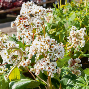 Le Bergénia Silberlicht est une plante qui se distingue par son feuillage remarquable. Ses larges feuilles coriaces et luisantes forment une rosette basale. Les équipes Willemse ont remarqué que cette dernière se pare de teintes rougeâtres ou pourpres en hiver dans les climats plus froids. Au printemps, de gracieuses grappes de fleurs en forme de clochettes, allant du rose pâle au blanc pur, émergent du centre de la rosette. Ses fleurs, d'un blanc pur, apportent une délicate beauté printanière au jardin, attirant les pollinisateurs. Bien que leur floraison soit éphémère, elle peut être prolongée en coupant les fleurs fanées. Cela stimule la croissance de nouvelles pousses et maintenant la vigueur de cette plante robuste.