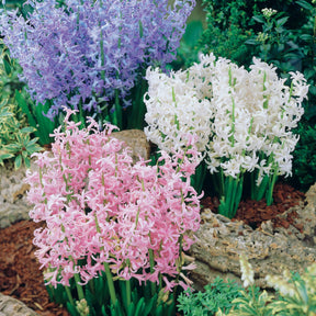 Chaque bulbe forme en avril un véritable bouquet de 3 à 5 tiges florales. Elles offrent un bel effet d'opulence et sont bien sûr délicieusement parfumées. Utilisation : en massifs, bordures, pots et jardinières. Cette collection est composée de 3 bleues + 3 blanches + 3 roses (circ. 17-18 cm).