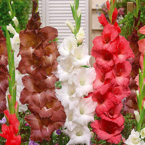 Dans le jardin, une explosion de couleurs prend vie avec les 30 Glaïeuls Indian Summer, Nova Zembla, Sugar Black en mélange. Ces glaïeuls captivent l'imagination avec leurs nuances flamboyantes, allant du rouge vif au noir profond, évoquant la chaleur vibrante de l'été et la richesse de l'automne.