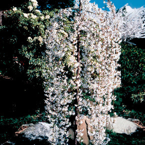 Le Prunus Snow Fountains est un arbre magnifique à port retombant et étalé. Particulièrement florifère, il comporte de fines fleurs blanches. Son feuillage caduc est de couleur vert tendre au printemps, et vire au jaune orangé en automne. Il convient à une plantation en isolé, afin de contempler sa beauté de manière optimale.