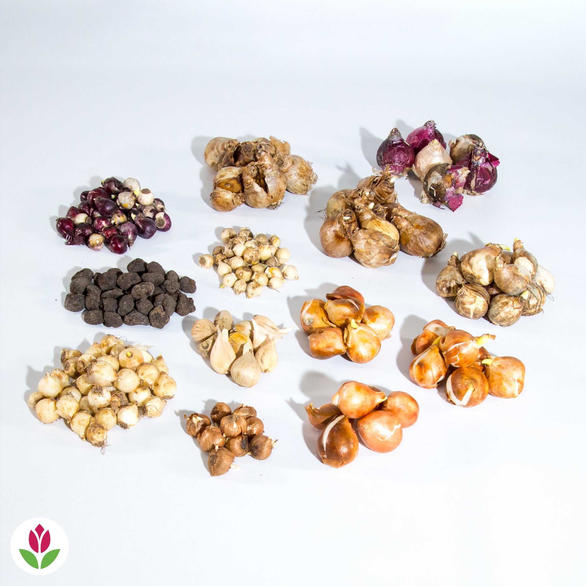 Comprend : 6 Tulipes Scarlet baby (10/11 cm) + 6 tulipes Golden Appeldorn (10/11 cm) + 6 tulipes Christmas Marvel (10/11 cm) + 10 Narcisses Tête à Tête (10/11 cm) + 6 Narcisses Salomé (12 cm/+) + 6 Narcisses Ice Follies (12 cm/+) + 6 Jacinthes mélange (14-15 cm) + 35 Muscaris armeniacum (6-7 cm) + 10 Iris Harmony (6-7 cm) + 10 Crocus vernus mélange (7-8 cm) + 34 Anémones Blue Shades (4-5 cm) + 35 Puschkinia libanotica (4-5 cm) + 30 Scilla siberica (6-7 cm). Calibre des bulbes en cm de circonférence.