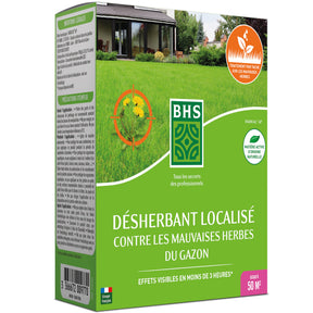 Désherbant gazon liquide concentrée BHS. Action très rapide avec des premiers effets visibles dans les heures suivant l’application. Grande souplesse d’emploi : utilisation possible dès mars et jusqu’à fin octobre sans condition particulière d’ensoleillement et de température pour une meilleure gestion du personnel de désherbage. Ressemis rapide : utilisation d’un semis de regarnissage possible seulement 24 heures après l’application.Période d'emploi optimale :