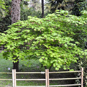 L'acer japonicum Aconitifolium est l’un des premiers érables du Japon à fleurir, sous forme de petites fleurs rouges, et émettre son feuillage caduc au printemps. Ses feuilles opposées et larges, de couleur vert tendre, prennent une coloration jaune puis rouge en automne. L'érable du Japon se plaît dans un sol acide de type terre de bruyère, à la mi-ombre.