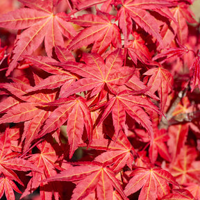 Le feuillage de l'érable du Japon Beni Maiko est sans doute l'élément qui attire le plus le regard. Ses feuilles palmées, finement découpées, présentent une texture qui rappelle le froissé, leur donnant une allure à la fois délicate et vaporeuse. Tout au long de l'année, ces feuilles changent de couleur. Elles débutent au printemps dans des nuances de rouge vif, rappelant la fraîcheur des bourgeons naissants. Puis, en été, elles se teintent de vert clair avant de revêtir un rouge flamboyant à l'approche de l'automne, offrant ainsi un véritable festival de couleurs.