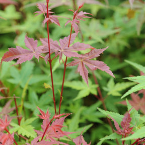 Cet érable du Japon n'est pas seulement connu pour son feuillage ; c'est aussi un arbuste qui, une fois adulte, mesure généralement entre 1 et 2 mètres de hauteur. De croissance plutôt lente, il se prête parfaitement aux jardins plus compacts ou aux zones où l'espace est limité. Mais ce n'est pas tout : au printemps, il se pare également de petites fleurs, variant du rouge foncé au rose pâle. Même si ces fleurs restent plus discrètes que le feuillage, elles apportent une nuance supplémentaire à la richesse esthétique de cet arbuste.