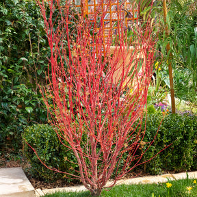 'Sango-kaku', est un arbuste fascinant qui attire l'attention avec ses tiges rouge corail, particulièrement visibles en hiver lorsque les feuilles sont tombées. Ce spécimen, par variété, est prisé pour son intérêt esthétique tout au long de l'année. Au printemps, ses feuilles émergent avec une teinte vert clair, procurant un contraste remarquable avec ses tiges colorées. Avec le temps, ces feuilles se transforment en un jaune lumineux à l'automne, ajoutant de nouvelles dimensions au spectacle visuel. Sa forme naturellement aérienne et évasée permet d'atteindre une hauteur moyenne de 6 à 8 mètres et une largeur jusqu'à 5 mètres, ce qui en fait un excellent choix parmi les