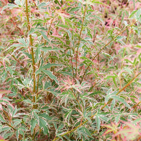 L'érable japonais au feuillage panaché est un arbuste compact et fourni, de croissance lente, à la silhouette élégante et raffinée. Il est connu pour son feuillage remarquable, qui passe du rose clair au printemps au jaune mêlé de rose en automne, créant une scène inoubliable dans le jardin. Il est cultivé depuis des siècles en Asie pour ses qualités ornementales. Aujourd'hui, il est un incontournable des jardins japonais et est apprécié dans le monde entier pour son charme et sa beauté.