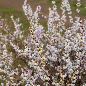 Originaires de Corée, les Forsythias blanc et rose ne jouissent pas de la même célébrité que leur homologue, le Forsythia jaune. Ils font néanmoins partie des premiers arbustes à fleurir et se présentent comme un baromètre annonçant les beaux jours. L'originalité des Forsythias blanc et rose réside dans le fait qu'ils dévoilent leurs fleurs avant leurs feuilles : un trait peu commun chez les plantes buissonnantes.