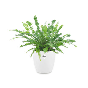 La fougère Duffi, également connue sous le nom de Nephrolepis exaltata 'Duffi', est une variété de fougère épiphyte originaire d'Amérique tropicale. Ses frondes vert foncé, finement découpées et retombantes, forment un feuillage dense et luxuriant. Les équipes Willemse ont remarqué que cette fougère est parfaite pour les coins sombres, aimant l'obscurité et l'humidité. Associée à son cache-pot blanc ELHO, la Fougère Duffi apporte une touche de verdure unique.