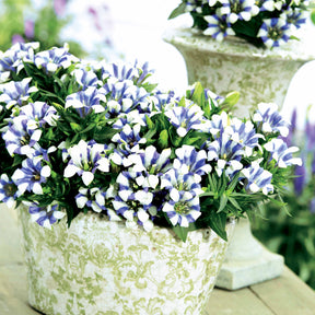La Gentiane 'Diamant des montagnes' se distingue avec ses fleurs blanches striées de bleu intense, qui donnent un effet vraiment spectaculaire en fin d'été.