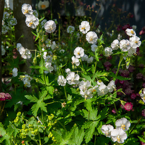 Le Géranium Vivace à Fleurs Blanches peut être harmonieusement associé avec diverses plantes pour enrichir la beauté de votre jardin. En le combinant avec des rosiers à fleurs blanches ou pastel, vous créez un espace romantique et intemporel, où roses et géraniums s'enrichissent mutuellement par une palette de couleurs et de textures. Pour un jardin méditerranéen, associez-le à des variétés de lavande : les fleurs blanches du géranium contrastent magnifiquement avec les tons violets ou bleus de la lavande, offrant un spectacle visuel et parfumé. Les heuchères, avec leurs feuillages pourpres, roses ou bronzes, fournissent un contraste saisissant avec le géranium, permettant des compositions harmonieuses et dynamiques dans les massifs et bordures. Enfin, les phlox paniculés à fleurs blanches ou rose pâle sont d'excellents compagnons, créant ensemble un tableau floral éclatant et équilibré qui attire papillons et abeilles.