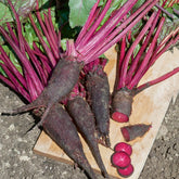 Les horticulteurs Willemse vous présentent la betterave rouge Crapaudine. Qui est une variété de légume racine, caractérisée par ses belles racines allongées en forme de cônes avec une chair rouge foncé bien sucrée. Son goût est très bon, et c'est une variété populaire avec une saveur douce et sucrée. Elle se consomme crue, râpée, cuite ou en salade.