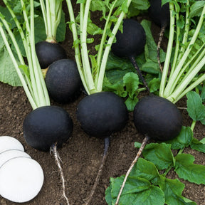 Le radis « Noir gros rond d'hiver » est un radis rustique, capable de résister au froid et aux gelées. Il constitue une nourriture fraiche parfaitement bienvenue pendant la saison froide, durant laquelle il est également plus abordable. Un ingrédient idéal pour ajouter de la variété à vos plats d'hiver, tout en apportant son lot de bienfaits pour la santé !