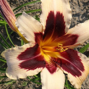 Cette plante vivace appartient à la famille des Liliacées. L'hémérocalle nous vient, à sa première origine, des pays asiatiques (Chine, Corée et Japon).L'hémérocalle Wild Horses est une vivace pouvant atteindre 90 cm de hauteur et dont les fleurs atteignent 15 à 18 cm de diamètre. Ses grandes fleurs possèdent des pétales épais et rigides aux formes larges. La fleur est caractérisée par trois couleurs, jaune crème saumoné portant un halo pourpre très foncé avec un cœur orangé.C'est une variété très décorative pouvant être utilisée en bordures ou en massifs. L'Hemerocallis Wild Horses n'est pas difficile quant à la nature du sol. Il se plaît facilement partout bien qu'il ait une préférence pour les sols frais. Entre le soleil et la mi-ombre, il s'adapte aux deux types d'expositions, même s'il montre une légère préférence pour le plein soleil. Ses feuilles sont linéaires, épaisses et robustes. Son feuillage est vert et de type persistant.L'Hemerocallis Wild Horses possède une particularité originale : il est comestible.Ses boutons ont un goût rappelant la noisette encore verte. Les fleurs se consomment très fraîches (moins de 4 h), elles ont le goût du fruit de la passion. Elles sont très décoratives dans les présentations de plats et surtout dans les salades.L'Hemerocallis Wild Horses peut naturellement être associé en massif avec d'autres variétés d'hémérocalles. Il en existe tant ! Avec cette belle plante d'extérieur, vous pouvez jouer sur les tailles, les formes et les couleurs. Les formes des fleurs sont en effet très variées (doubles, simples, ondulées ou en trompette, etc.). Suivant les variétés, il est également possible de jouer sur les dates de floraison. En associant des variétés précoces et tardives, vous en profiterez plus longtemps.Attention : il faut veiller à enlever les fleurs fanées. Rappelez-vous que la fleur ne dure qu'un jour, il faut donc encourager les différentes hampes florales pouvant porter jusqu'à 30 boutons. Il ne faut pas hésiter à y mettre la main !