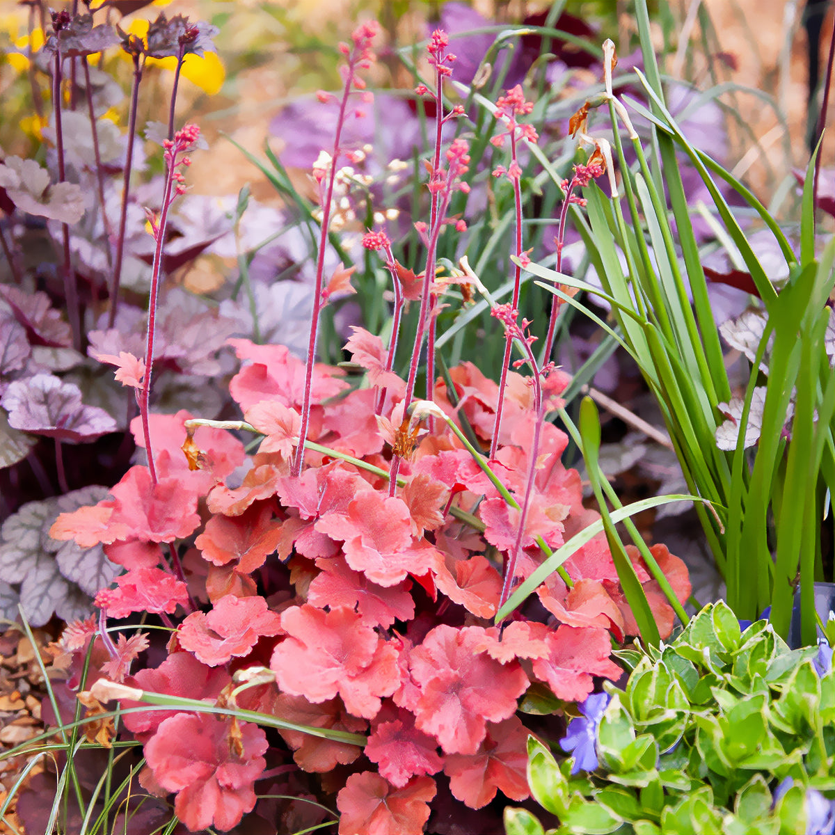 Heuchère Autumn Leaves est une plante vivace pouvant atteindre 35 cm de haut et 40 cm d'envergure.Cette plante rustique résiste à des températures jusque -15°C. Elle apprécie une exposition soleil, mi-ombre. La période idéale de plantation est de février à mai et de septembre à novembre pour une floraison de juin à juillet.