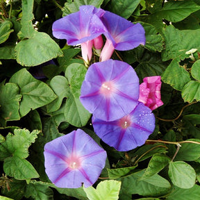 Majestueuse plante grimpante, l’ipomée à grandes fleurs (Ipomea grandiflora) a tout pour plaire : un feuillage abondant, une croissance vigoureuse et de belles et grandes fleurs en forme d’entonnoir, d’un violet intense durant tout l’été. Plantée en pot ou en pleine terre, cette plante volubile recouvrira rapidement les supports que vous aurez choisis pour elle (treillis, grillage, tonnelles…). Vous pourrez aussi l’utiliser comme couvre-sol sur talus, murets, rocailles… Par ailleurs, l’ipomée à grandes fleurs est facile à cultiver, s’adapte à tous les types de sols et ne demande aucun entretien particulier !