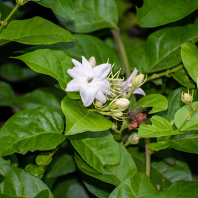 Le Jasmin d'Arabie se combine à merveille avec d'autres plantes grimpantes comme le chèvrefeuille ou la clématite. Ces associations ne créent pas seulement une toile visuelle impressionnante mais apportent une diversité de parfums dans le jardin. Il peut également être planté avec des vivaces à floraison colorée pour créer des contrastes saisissants qui mettent en valeur ses fleurs blanches. Dans un jardin en terrasse, associant jasmin avec des pots de lavande ou de géranium citronné accentue encore davantage l'aspect sensoriel.Le saviez-vous ?