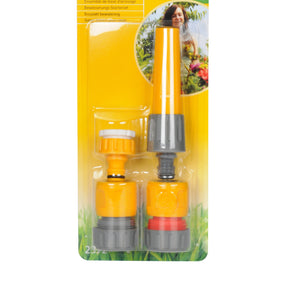 Kit d'arrosage comprenant une lance d'arrosage ajustable et 2 raccords pour tuyau 15mm et 19mm et 1 raccord robinet fileté extérieur. Ces embouts et accoupleurs sont conçus pour vous aider à configurer votre système d’arrosage. Les raccords, la lance et l'embout fournis sont conçus pour configurer un système d'arrosage.