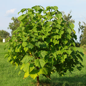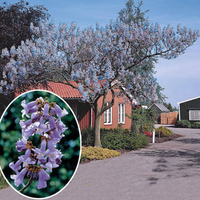 "L'arbre impérial" nous vient d'Asie, plus précisément de Chine et de Corée. C'est un arbre important pour les pays d'Asie puisqu'ils l'exploitent pour produire de la biomasse. En effet, la croissance prompte de l’arbre permet la production abondante de charbon de bois et de fourrages pour les animaux d'élevage. Par ailleurs, grâce à son système racinaire puissant, "l’Arbre impérial" est même capable de survivre à un incendie ! Cet arbre à feuilles caduques est très rustique et pousse parfaitement dans nos régions. Il peut mesurer jusqu'à 10 mètres de haut et sa taille peut atteindre de 3 à 4 mètres en l'espace d'un an seulement ! Les grappes de fleurs, d'une douce teinte mauve, se dressent en de longs épis, apparaissant vers le milieu du printemps, avant le feuillage. Elles sont fortement mellifères et exhalent un parfum délicat de violette. Comme son nom latin l'indique, le Paulownia tomentosa est doté de feuilles tomenteuses (cotonneuses). Lorsqu’on y passe sa main, on peut ressentir le léger duvet qui en habille les deux faces. Les feuilles, vertes durant la belle saison, prendront une jolie teinte jaune à l'automne avant de disparaître pour nous laisser admirer des élégants rameaux tortueux.