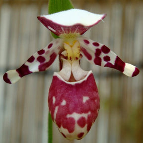 Une orchidée tout à fait magnifique. Ce sabot de vénus est très résistant au froid (-30°C). Elle fleurit en proposant une belle hampe florale mesurant 20/30 cm. Ses fleurs aux sépales et pétales blancs maculés de rose et labelle renflé blanc maculé de rose feront l'admiration de votre entourage. Son feuillage est vert et allongé. Ces plants agés de 4 ans sont en âge de fleurir ! Plantes livrées en dormance de Septembre à Avril. Délai de livraison 4 à 6 semaines.
