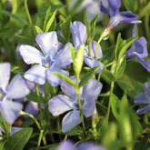 La petite pervenche "La Grave" ou "Bowles Variety" est une plante vivace à croissance rampante. Elle a des tiges ligneuses et des feuilles persistantes de couleur vert foncé. Ses fleurs vivaces en forme d'étoile sont d'un bleu profond et se développent au printemps, ajoutant une touche de couleur vibrante aux zones ombragées du jardin. Elles sont suivies par des baies décoratives qui persistent tout au long de l'été, offrant un intérêt visuel supplémentaire. La plante atteint généralement une hauteur d'environ 10 à 15 centimètres et préfère les sols riches en humus et bien drainés.
