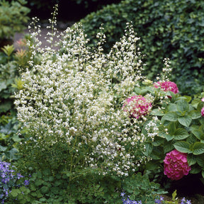 Le Pigamon Delavayi Blanc, avec ses délicates fleurs étoilées, se marie harmonieusement avec une variété de plantes pour créer un jardin équilibré et esthétique. Cette plante, appréciant l'ombre partielle, s'associe bien avec les hostas, dont le feuillage luxuriant contraste avec ses fleurs fines. Les fougères, avec leur texture plumeuse, complètent également le Pigamon par leur structure et leur verdure persistante. Pour ajouter de la couleur, les heuchères, disponibles dans une gamme de teintes allant du pourpre au bronze, offrent un arrière-plan riche qui met en valeur la blancheur éclatante du Pigamon. Enfin, l'introduction de l'aster, qui fleurit à l'automne, permet de prolonger l'intérêt visuel du jardin bien après la floraison du Pigamon au début de l'été.