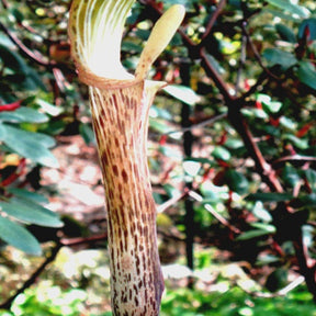 Voici un bulbe très résistant au froid et à la floraison exceptionnelle. En effet, de son tubercule cylindrique allongé sort une grande fleur en forme de spathe très alongée à la manière des Arum de couleur vert lavé de pourpre. Viennent ensuite les feuilles. Chaque tige porte trois pétioles et trois feuilles.Température minimale de conservation : -20 °C Exposition recommandée : Pleine lumiere sans soleil direct. Livré en dormance au printemps. Cette plante cultivée en Thaïlande nécessite un délai de transport de 4 à 6 semaines. Elle sera livrée directement chez vous.