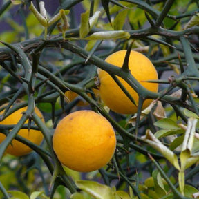 Bel arbuste épineux proche du genre Citrus. Floraison blanche parfumée. Petits fruits oranges à la peau veloutée non comestibles. Excellente résistance au gel jusqu'à -20°C (la plante est alors caduque). Délai de livraison 4 à 6 semaines.