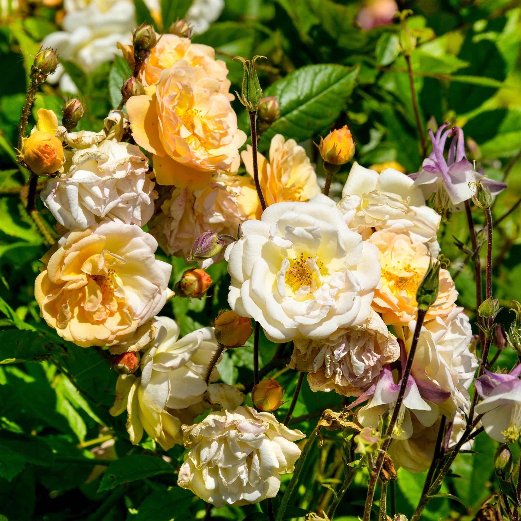 Pour sublimer un Rosier Ghislaine de Féligonde, associez-le avec des lavandes ou des népétas, qui complètent harmonieusement ses teintes douces. Ces plantes accentuent la rusticité et résistent bien au gel, apportant un contraste élégant au feuillage vert du rosier. Installez-les en massif ou en bordure pour un jardin raffiné et facile d'entretien. En optant pour ces compagnons, vous créerez un jardin harmonieux et coloré tout au long de l'été.