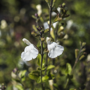 Résistante au froid jusqu'à -7°C, cette espèce tolère les températures basses. Ses feuilles vert grisâtre sont ovales et légèrement velues. Elles ajoutent une texture intéressante au feuillage. Les tiges, ligneuses à la base, se ramifient pour former un buisson compact. Les fleurs, blanches et délicates, sont disposées en épis le long des brins. Elles attirent les insectes pollinisateurs.