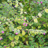 La Symphoricarpos x chenautii est un arbuste remarquable pour ses petits fruits ronds aux teintes rosées ou rouges apparaissant vers la fin octobre. Cet arbuste tapissant et très étalé se distingue par sa capacité à couvrir le sol, ce qui le rend idéal pour la plantation au pied des arbres ou dans des haies champêtres. D'une hauteur pouvant atteindre 2 mètres, la Symphorine de Hancock présente un feuillage caduc à petites feuilles vert foncé, qui vire à une teinte rousse à rouge en automne.