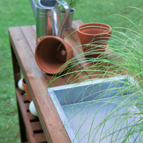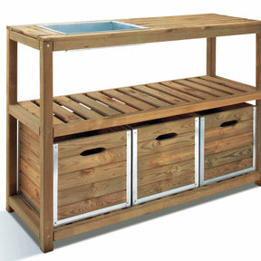 Table de préparation teintée brun. Marque: BURGER JARDIPOLYS. Une table de préparation conçue pour jardiner de manière confortable: faire vos semis, rempoter, transplanter...tout est plus facile en ayant tout à hauteur. Son bac en zinc vous permet de rempoter vos plantes très facilement et de garder une zone de travail propre. Ses 3 caissons de rangement et son étagère vous permettront d'avoir à proximité tous vos outils. Dimensions hors tout: L 129 x P 45 x H 90 cm. Dimensions des caissons: L 39 x P 35,5 x H 39 cm. Caissons livrés montés. Matière: bois de pin certifié FSC et Zinc. Finition: traitement autoclave teinté brun.
